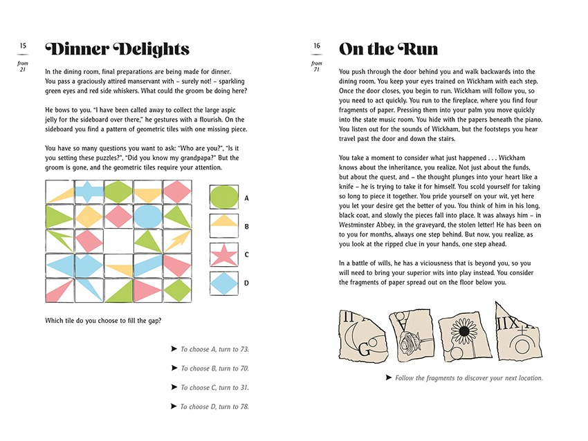 The Adventure of Miss King’s Inheritance runs parallel to the events described in Pride and Prejudice, and throughout the book, the reader will interact with the characters of Austen’s novel. There are over 40 puzzles in the book, ranging from riddles and mazes to logic problems and visual conundrums. Solve them correctly and you’ll be on the path to wealth and love, but get them wrong and you could be condemning Mary to a far less rosy future…